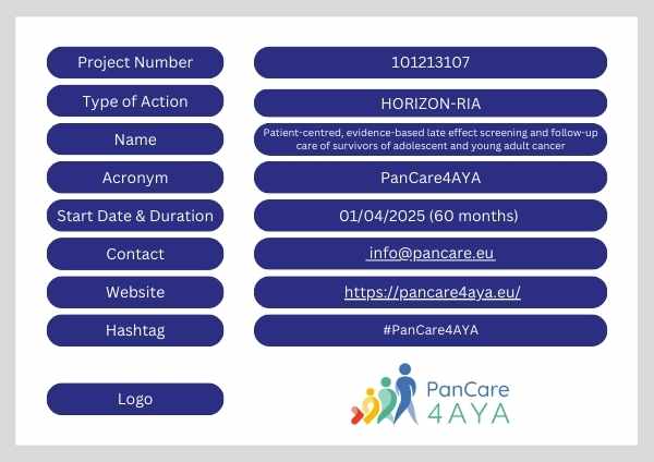 PanCare4AYA is a 5-year EU-funded project (Horizon Europe) that kicked-off on 1 April 2025. It aims to improve the long-term health and quality of life of adolescents and young adults (AYA) diagnosed with cancer. Despite improved survival rates, many AYA cancer survivors face unmet needs in follow-up care. PanCare4AYA will develop, implement, and evaluate an international clinical guideline and a screening programme to make Survivorship Care accessible and effective across Europe